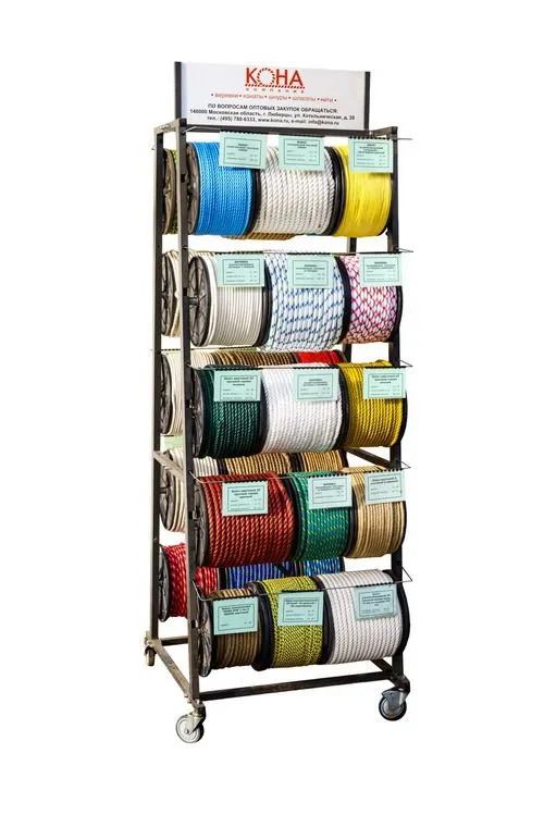 Стенд для реализации канатов, веревок и шнуров позволяет клиенту удобно рассмотреть и выбрать товар, а продавцу отмерить и отрезать изделие нужной длинны. На стенде возможно разместить до 40 видов продукции на полипропиленовых катушках шириной 200 мм и 300 мм.